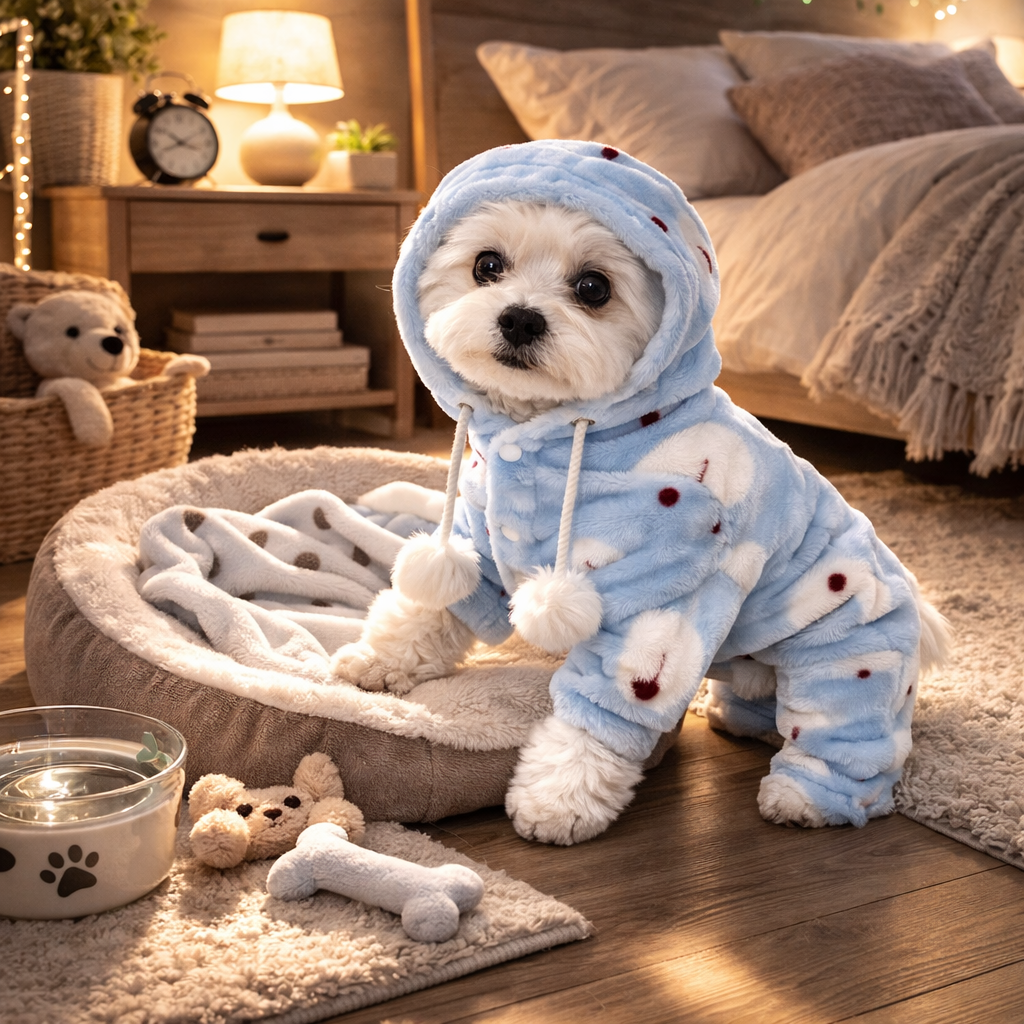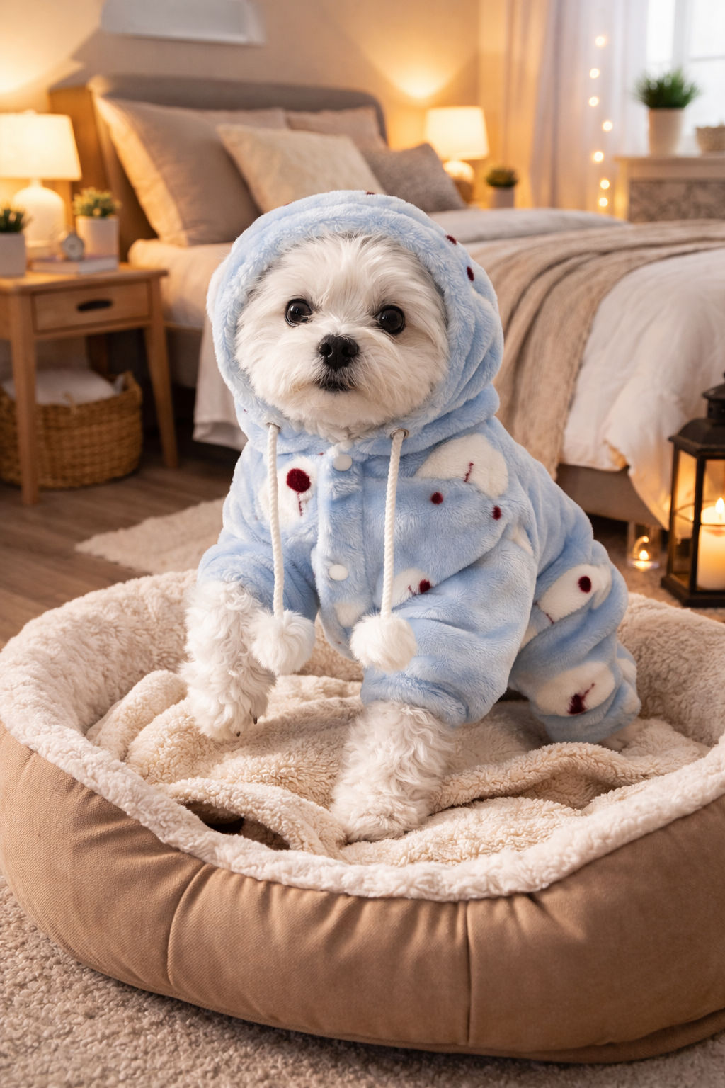 Premium plush dog onesie in blue with adorable teddy bear design by Urban Pup. Made from ultra-soft micro-fibre fleece with elasticated arms, legs, and hem for secure fit. Features three chest poppers for easy dressing, pom-pom details, and hooded design. Perfect for post-bath warmth, bedtime comfort, or loungewear for small to medium dogs. Machine washable. Available in multiple sizes.