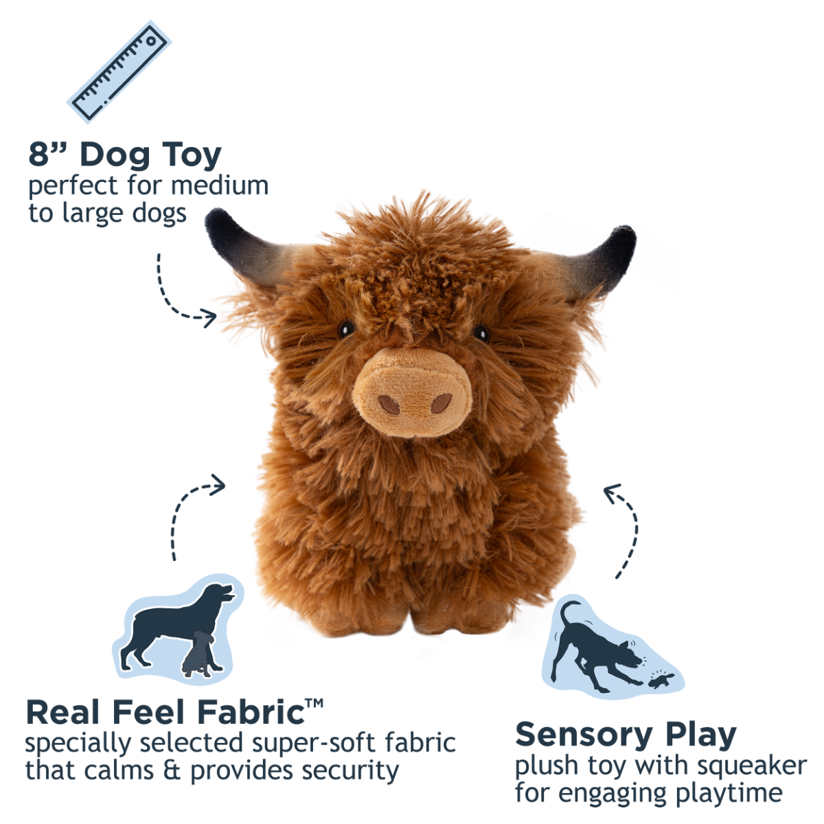The Tall Tails Highland Cow is versatile—perfect for interactive fetch, gentle tug games, cuddling, and solo play. The squeaker adds auditory stimulation to keep dogs engaged.